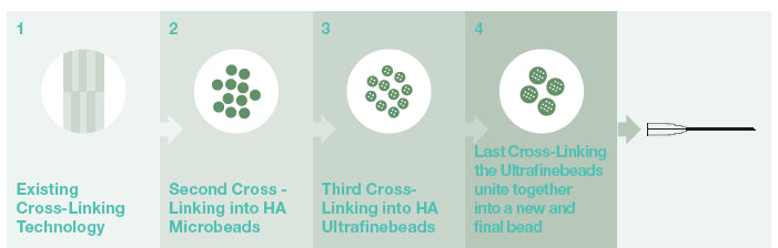 VOLOMIS HA Fillers use a high quality Hyaluronic acid to create a product that shows an increased Cross Linking rate. Our product overcome the conventional fillers on the market due to the special multi – staged cross-linking technology used to create three layered small beads that resolves the difficulty of creating a longlasting